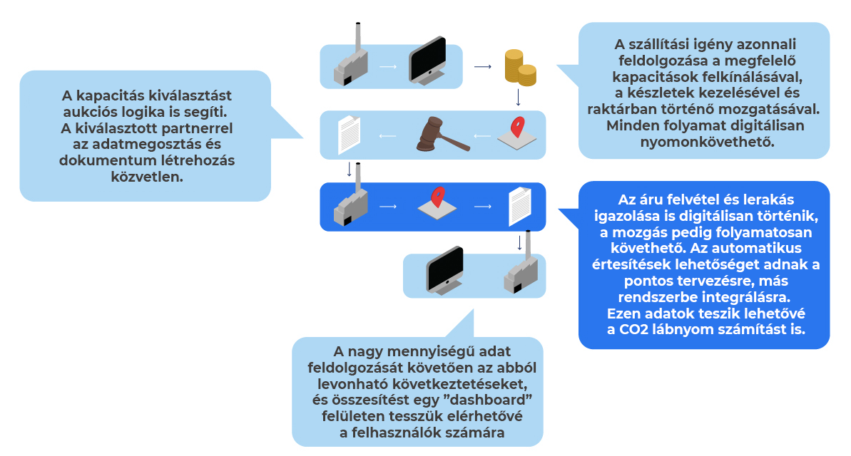 A platform lehetőséget biztosít a szálltási költségek folyamatos nyomonkövetésére és menedzselésére és közvetlen elérést biztosít a piaci szereplőkhöz.
